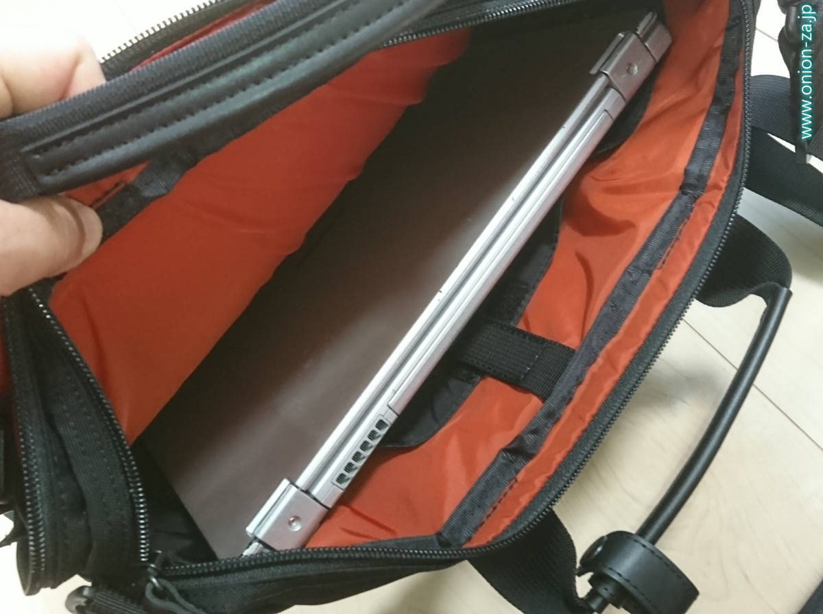 A4サイズのノートパソコンである12.5インチのレッツノートCF-MX3を入れてみました。全然余裕なので横にACアダプター入りそうです。