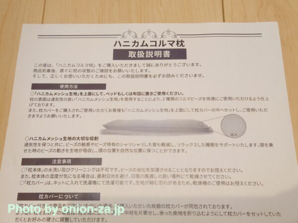 ということで「スーパーホテル仕様」と銘打つハニカムコルマ枕の取扱説明書はこんな感じ。全部出すとなんかアレだったので上半分だけ。あやしい中華製品と違って分かりやすく書かれているところに好印象。